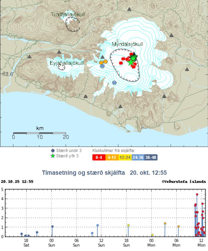 Öflug jarðskjálftahrina hófst í Mýrdalsjökli um kl 10:30 i morgun. Stærsti skjálftinn hingað til mældist M 4,5 og nokkrir yfir M 3. Skjálftarnir virðast vera á 1-5 km dýpi. Virknin er í norðaustanverðri öskjunni, nálægt þekktum jarðhitasvæðum.